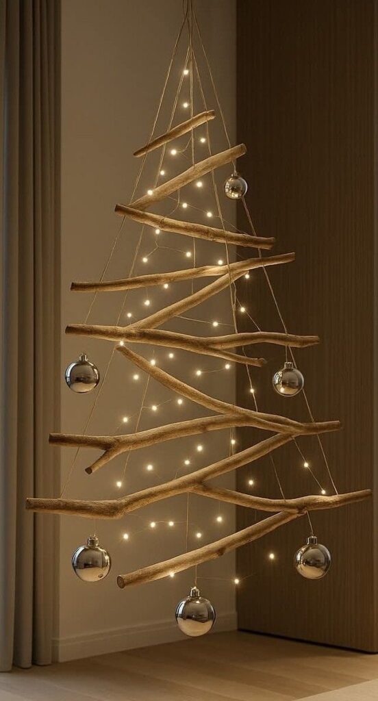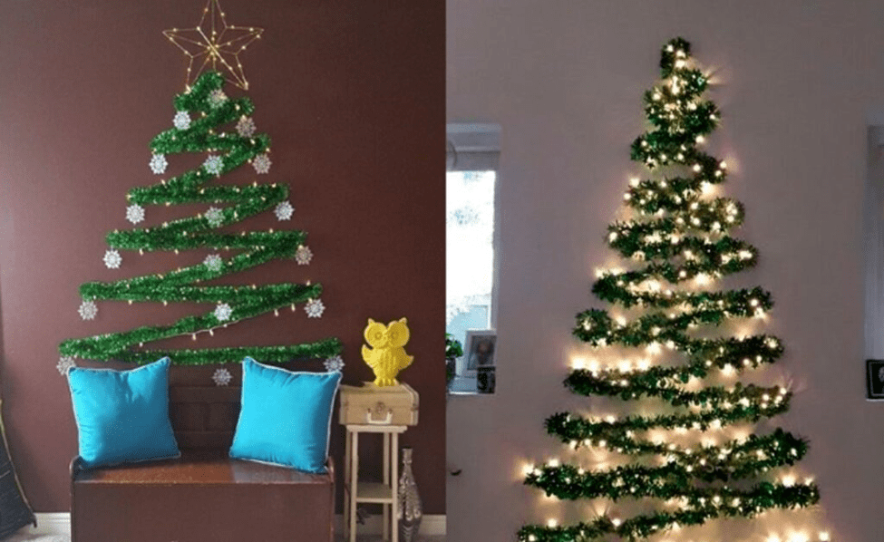 Nếu không thể trang trí nhà bằng một cây thông với kích thước lớn thì bạn có thể tự sáng tạo mô hình cây thông theo ý của riêng mình bằng giấy hoặc tạo hình cây thông trên tường bằng dây thừng hoặc dây đèn đều rất bắt mắt nha.