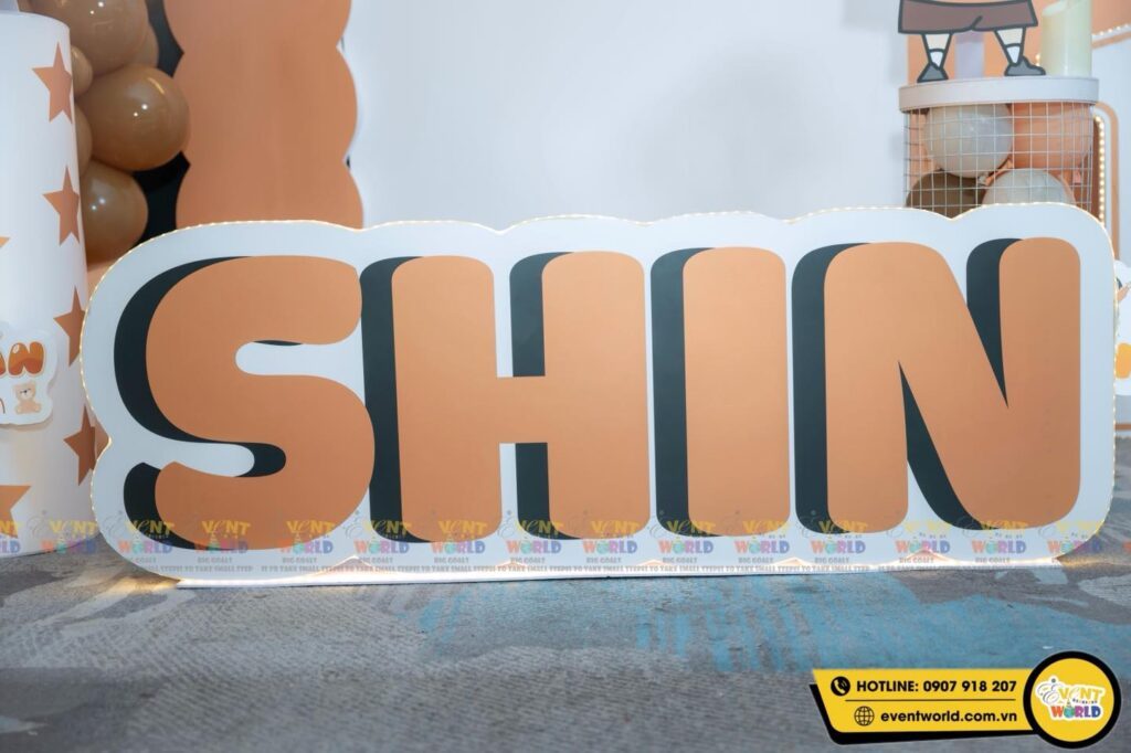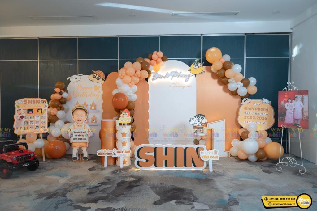 Backdrop sử dụng tông màu cam – nâu – trắng làm chủ đạo kết hợp cùng các chi tiết hoạt hình shin quen thuộc, tạo nên không gian trang trí vừa hiện đại vừa dễ thương, rất phù hợp cho tiệc thôi nôi bé trai.