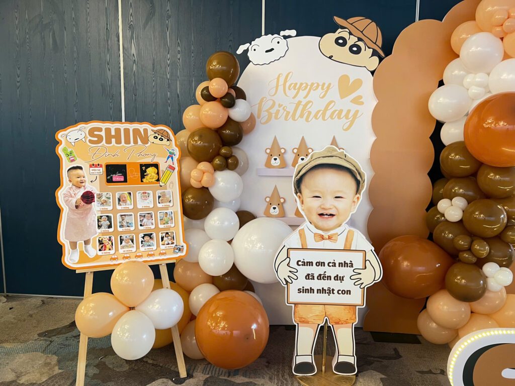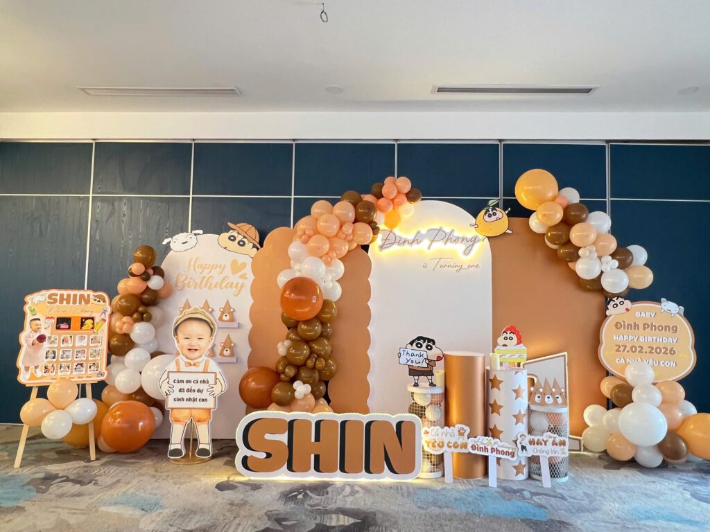 Sinh nhật đầu đời luôn là cột mốc đặc biệt đối với mỗi em bé và gia đình. Mẫu backdrop trang trí sinh nhật 1 tuổi bé Đình Phong được thiết kế theo chủ đề Shin – cậu bé bút chì vô cùng đáng yêu, mang lại không gian bữa tiệc vui nhộn và đầy màu sắc.